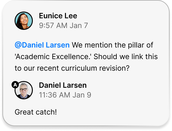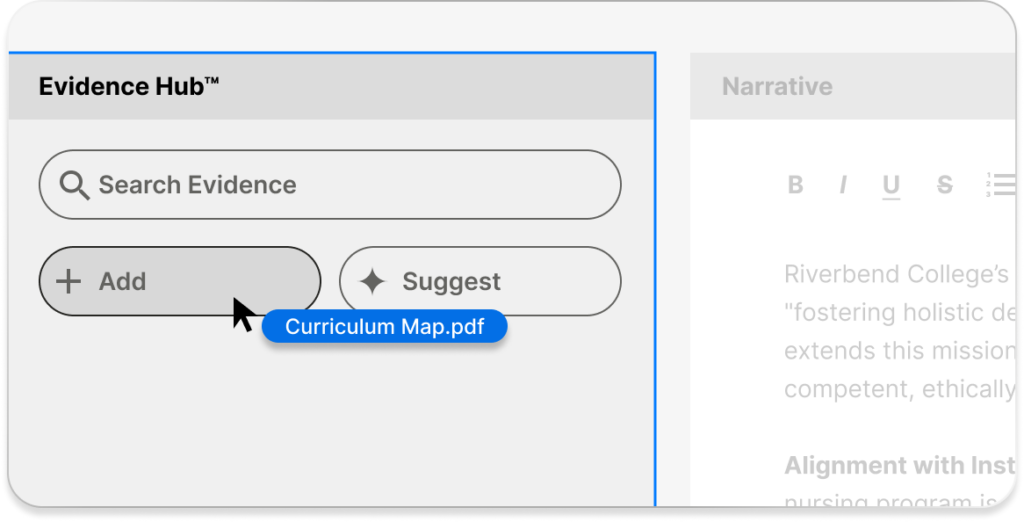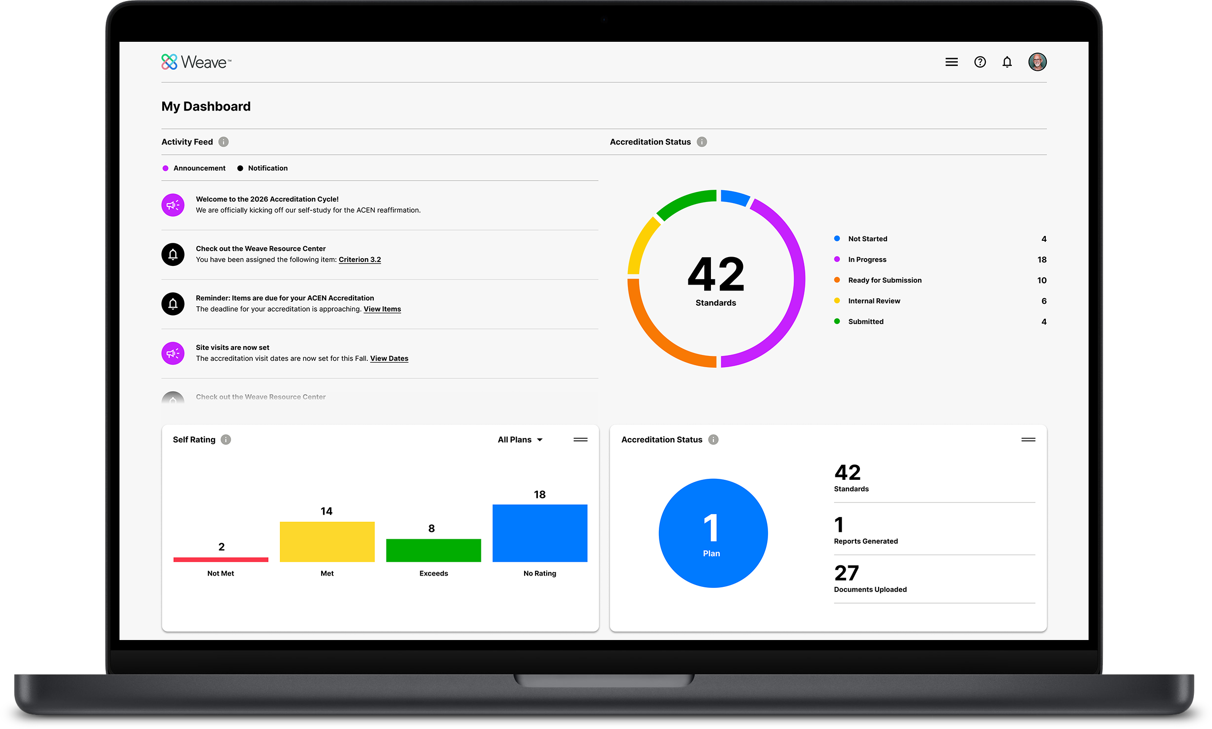 NO MORE scattered evidence or unclear progress! Work together to gather evidence, draft narratives, and maintain clarity across standards. Weave fosters seamless cooperation between faculty and administrators. Everyone knows their role and contributes effectively without friction.