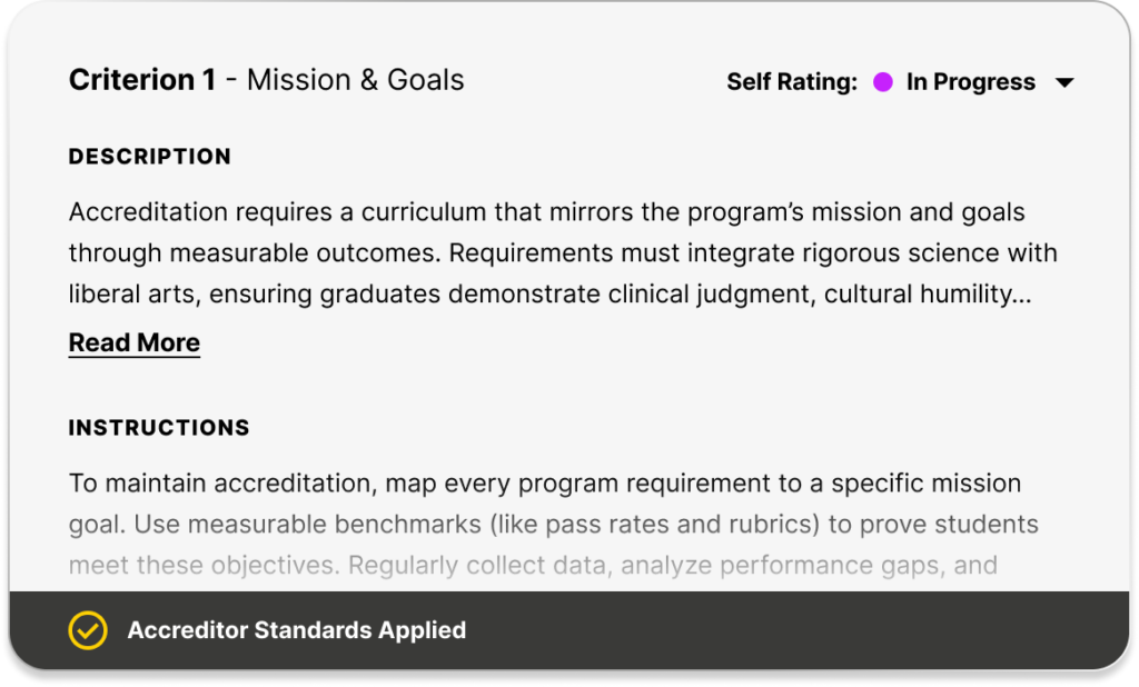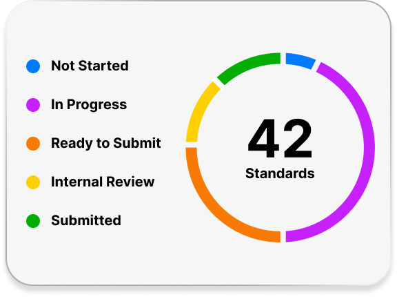 Quickly assess accreditation progress, identify standards met or needing attention.