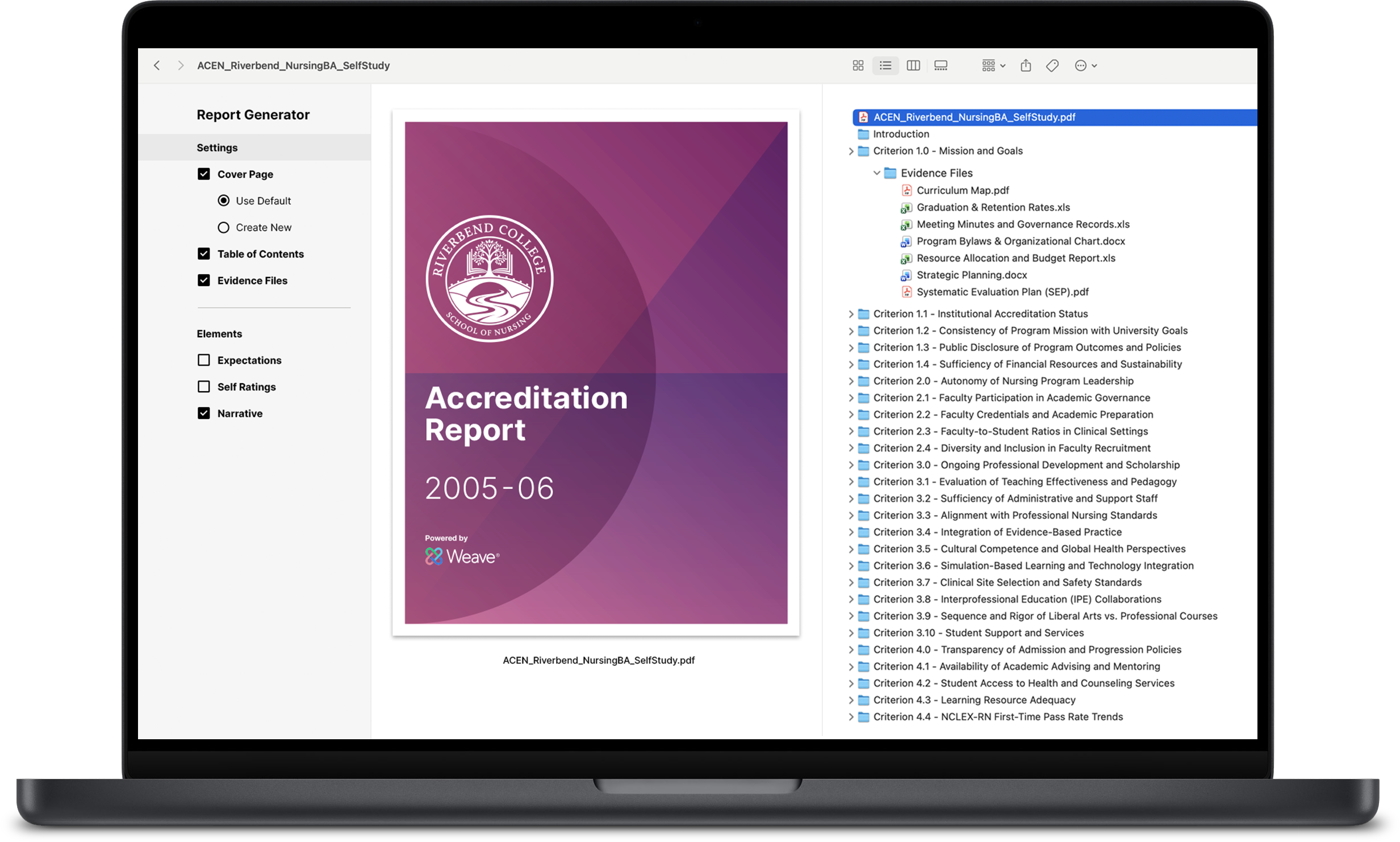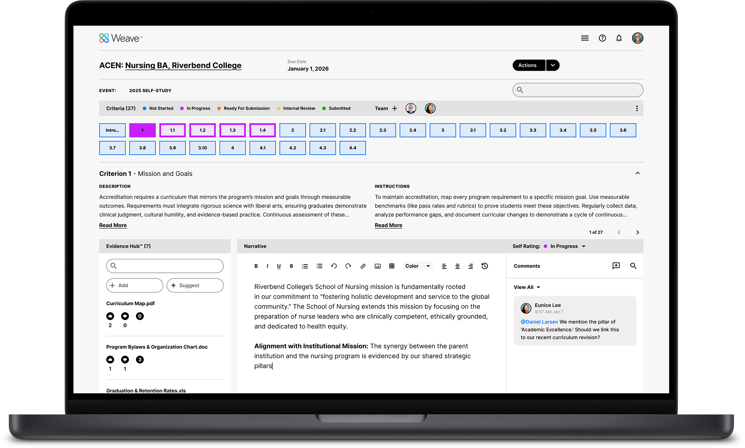 Stop chasing email attachments and loose files. Weave meticulously organizes standards, evidence, and critical narratives within a single, accessible panel. Unlimited storage for all supporting materials.