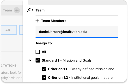 Organize your team members based on expertise and assign them to specific standards or sub-criteria. Set norms for how the team will collaborate.